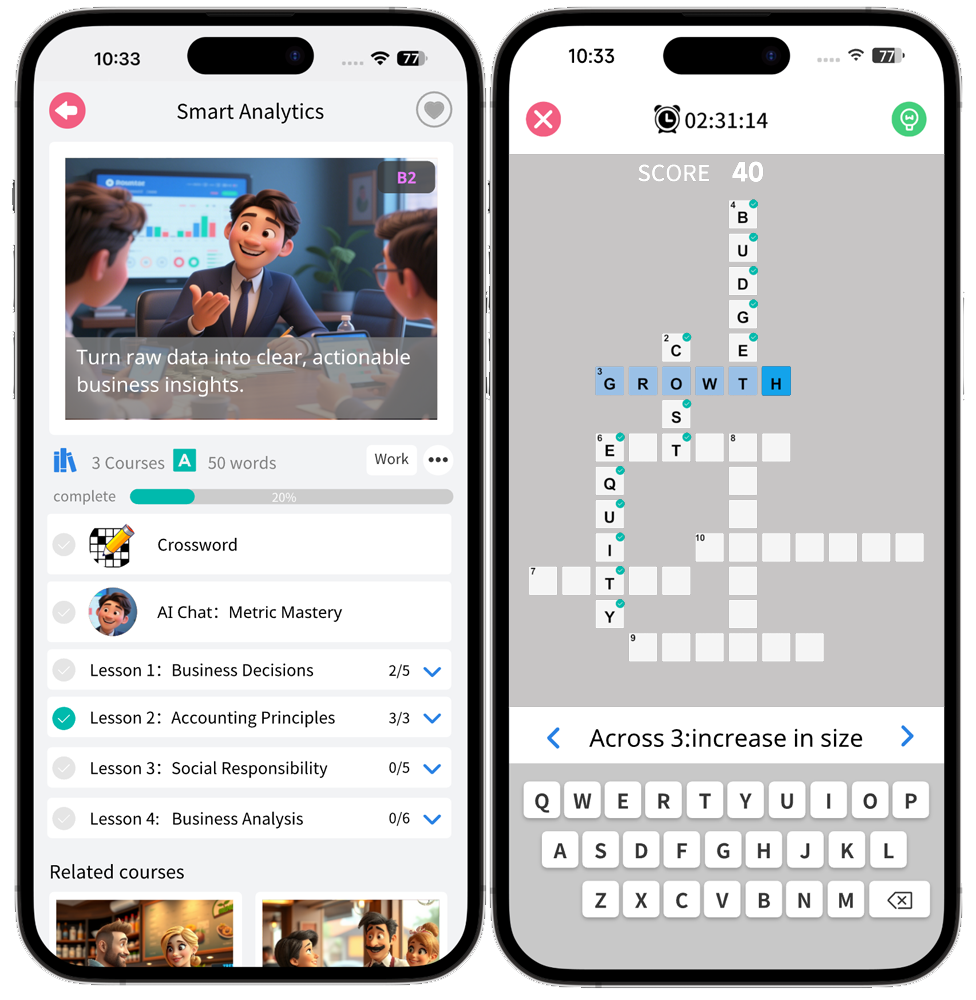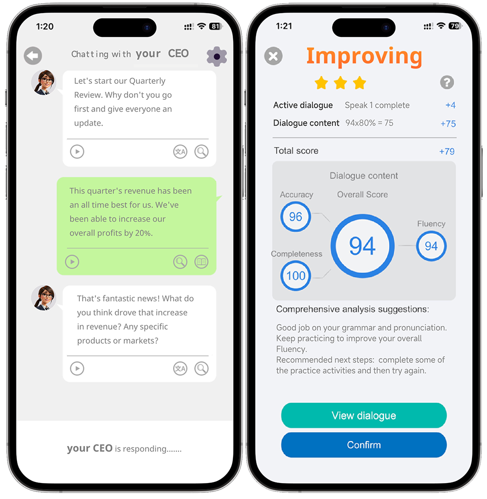 Combined with real-time scoring, analytics and feedback enable a continuous and effective cycle of practice – learn – practice.